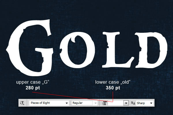 现在我们可以打造文本的初步效果。首先使用文字工具,选择Pieces of Eight字体,G要大写280pt,剩下的”old”小写350pt,选择”锐利”如下图,将写好的文本放置在图像的中央。