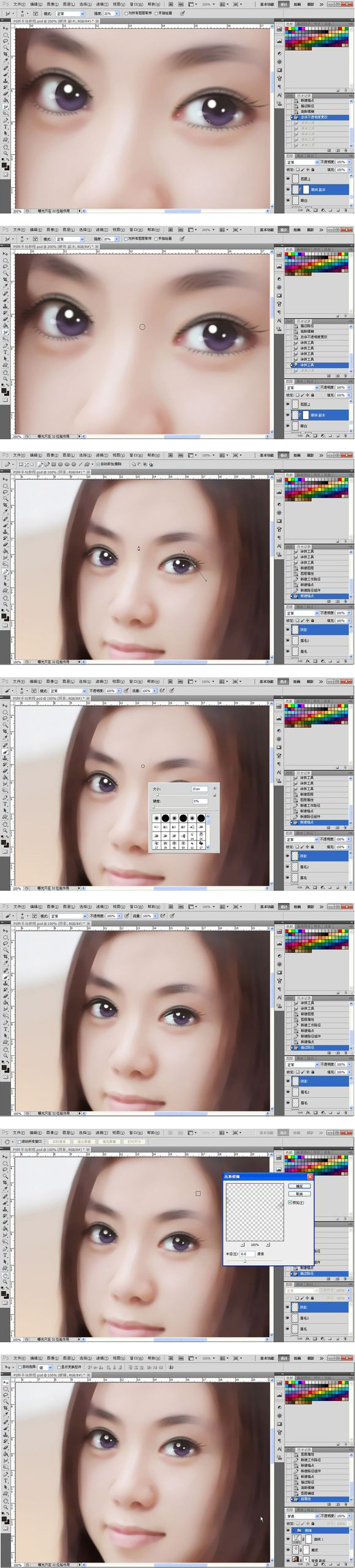 22、接着我们发现眼珠有点锐利,不够融合,选择眼珠图层,用涂抹工具涂抹边缘,效果如图所示,再次发现眼睛少了阴影,新建一个图层,命名阴影,如图勾出两条路径,画笔大小15左右,再高斯模糊一下效果如图所示,眼睛部分到此结束,【ctrl+G】把眼睛的所有图层合成【组】。