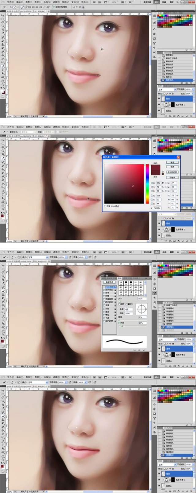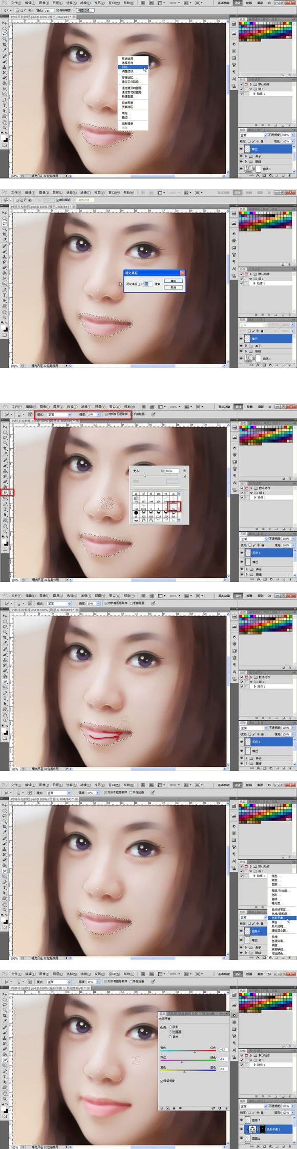 27、唇线也不难,沿着唇线勾出如图路径,选取嘴唇一个比较深的颜色,画笔设置如图所示,之后高斯模糊一下,效果如图所示。唇线的目的是为了让嘴唇更立体。