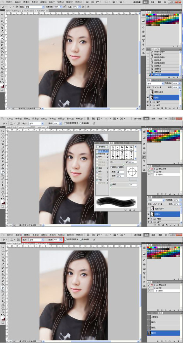 31、之后就是勾头发路径,看不见头发纹理的可以先把图层7和背景副本图层关闭,勾好之后再显示,之后选择涂抹工具,选择100号笔刷,像头发那样的,设置如图。 【描边路径】【选择涂抹】【模拟压力】可以描边两次,第二次可以适当降低涂抹强度,效果如图。