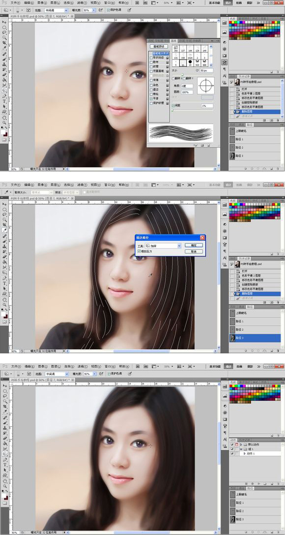 32、接着选择加深工具,选择50号笔刷,设置如图,【描边路径】【选择加深】【模拟压力】,有发丝的感觉了,哈哈,头发到此就结束了。