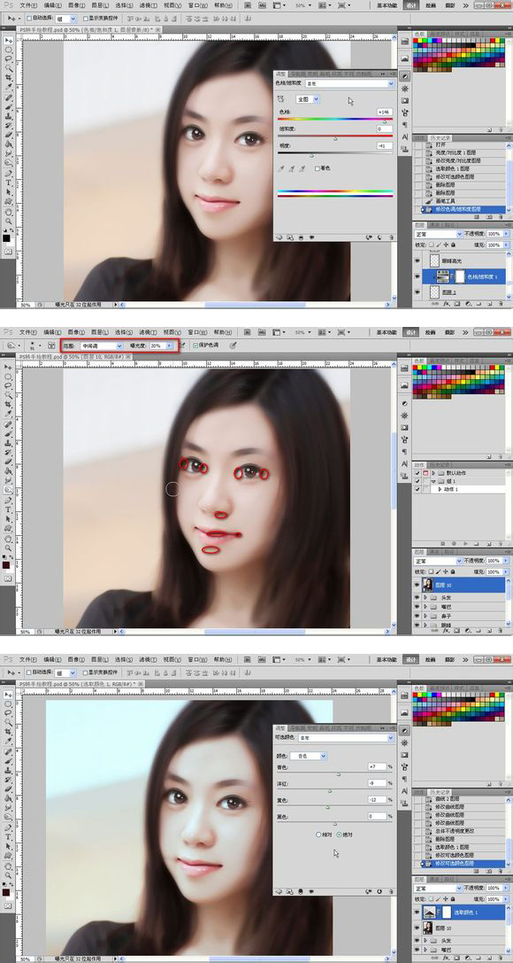 进行调节,之后按键盘的【ctrl+shift+alt+e】盖印图层做最后的调整,阴影如图用加深工具进行涂抹,再调整一下颜色就大功告成了。