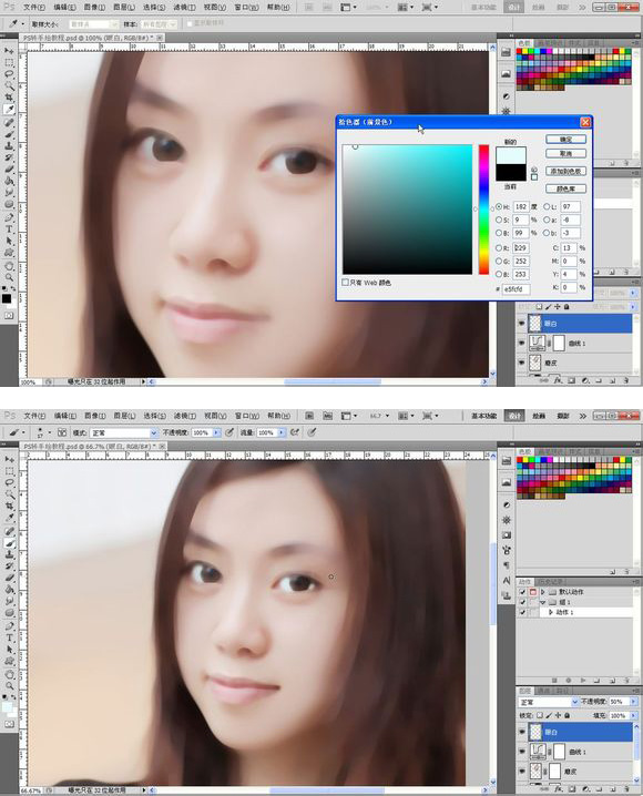首先先弄眼白,【新建图层】命名:眼白。选择如图所示颜色,大概就行,不要纯白色,记住除高光之外都不要用纯色,纯色会显得很生硬,用【画笔工具】在人物眼白部分涂抹,之后降低图层透明度,眼白部分结束。