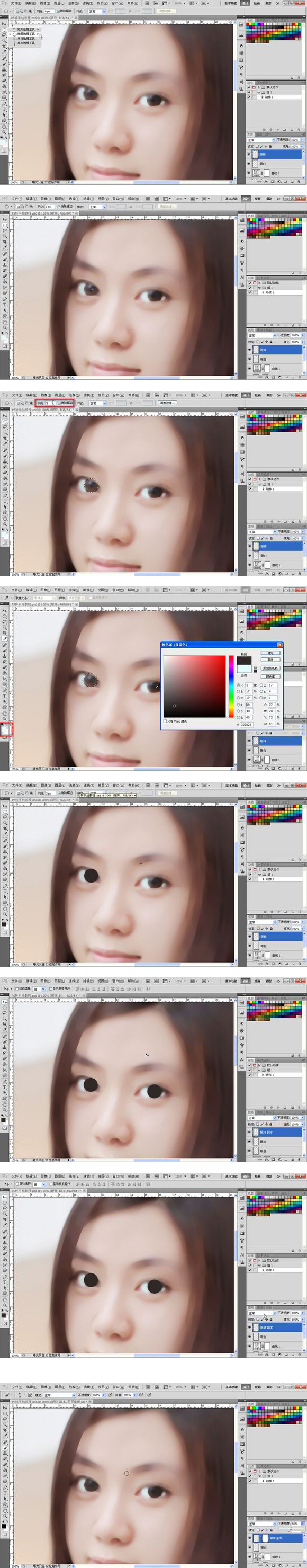 如图所示选择【椭圆选框工具】按住键盘上的【shift+alt】规则拉出一个圆,如图所示羽化3像素,选择一个比较深的颜色,接近黑色的颜色。按键盘上的【alt+delete填充前景色】如图所示,接着复制眼珠图层把另外一只眼珠也做出来。