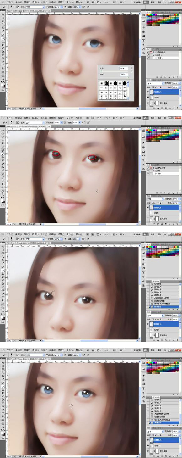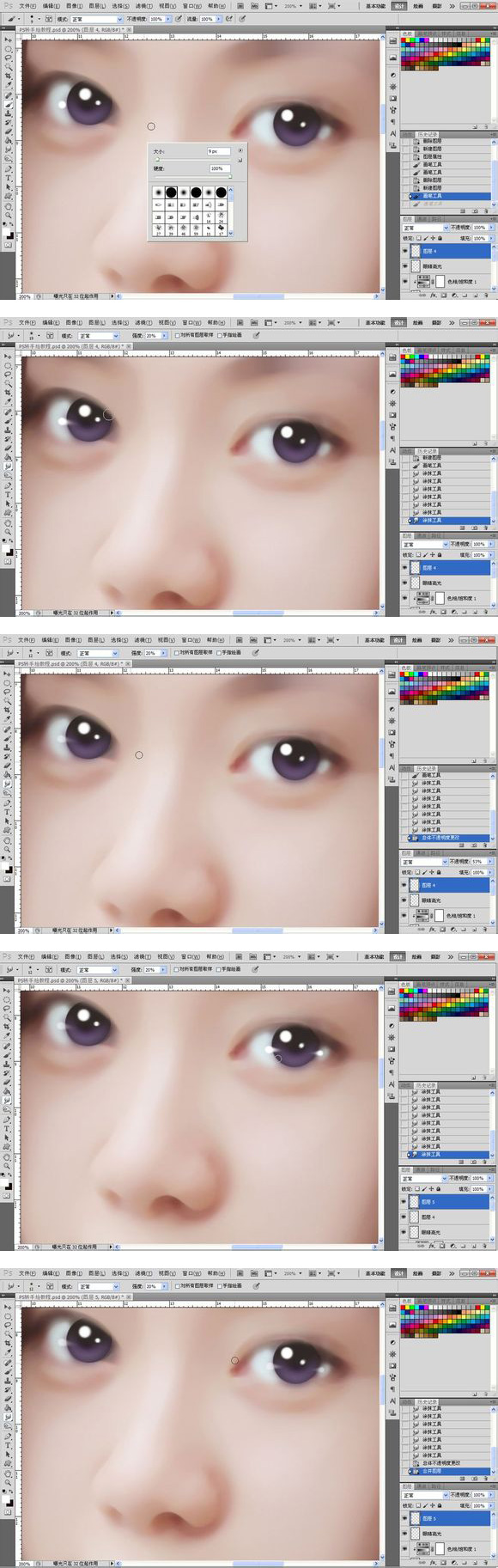 14、之后我加了一个色相饱和度调整图层,把眼睛的颜色改变了,继续加高光,新建图层,如图所示点个小点,之后用涂抹工具涂抹出一条小尾巴,降低透明度,右眼一样,为了让眼睛更加立体。