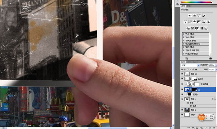 22、我还找了一张划痕的素材,剪切蒙版(Ctrl+alt+g)在老照片上。