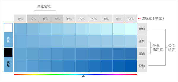 即:用纯白色(#ffffff)和纯黑色(#000000)通过“叠加”和“柔光”的混合模式(效果类似调整饱和度和明度),在任意一个色彩上得到最匹配的颜色(然后通过调整透明度选取最适合的辅色)。