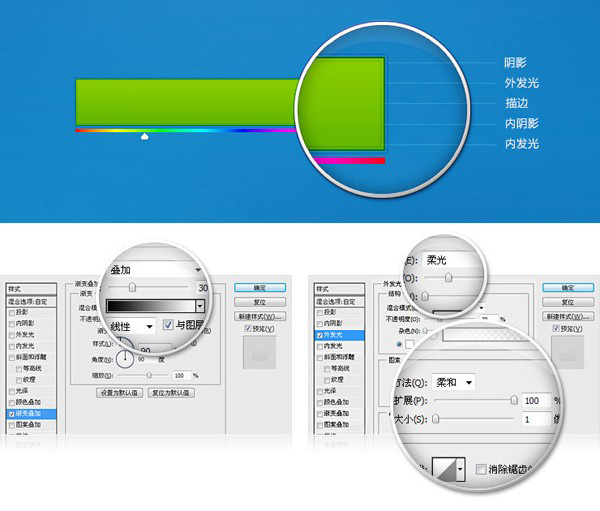 通过混合选项中的“阴影、外发光、描边(不适用叠柔法)、内阴影、内发光”可以自由的刻画5层像素级细节(当然,通常在实际的使用中刻画1到3层即可)。