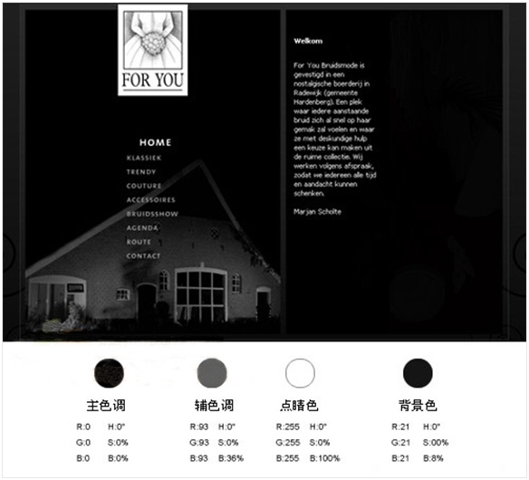 黑白纯色在明度上反差非常大,视觉冲击强烈,主次分明,全站的贯穿运用,构成特色鲜明的设计风格,散发迷人的高品位的贵族气息。