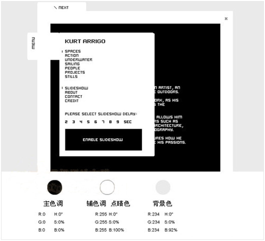 从RGB数值都是234来上看可知,255为白色,背景色234只是在明度上稍做变化得到的浅灰色。背景的浅灰色把前景的白黑对视觉的刺激力变得柔和协调很多。虽为背景灰色,实际在整个页面配色作用上起到了点睛之笔,使得页面焕发出另外一种神秘且特殊的气息。