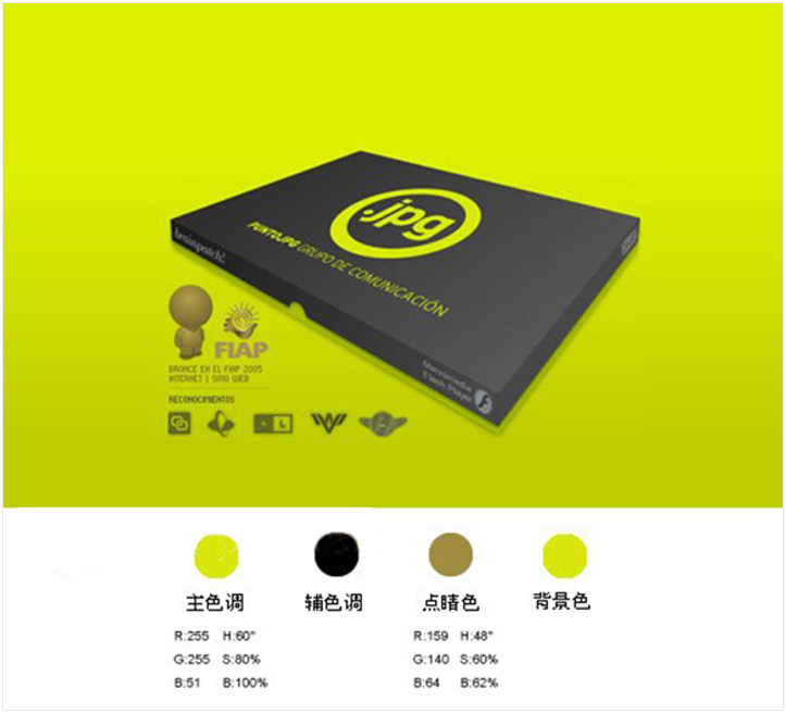 处于辅助色的非色彩黑色,中间的点缀色是主色调黄绿色,很容易让人一时以为该颜色就是点睛色。实际主色调黄绿色的明度非常高,饱和度这时也很高,在明度最低的黑色衬映下就异常显眼。