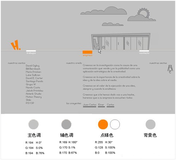 从RGB所呈现的均衡数值及HSB模式的HS都为零来看,主色调的浅灰色属于非常纯净的非色彩,没有掺杂其他色系进去。而辅色调的两个模式上就有些差异,HSB模式的H显示180度色相上偏青蓝色,有及其微弱的饱和度,明度也较低。点睛色壬?SB显示为正桔红色且饱和度和明度都为100%,应该是及其耀眼的颜色,然而在大面积背景主色调下,此种耀眼的颜色得到缓解,这正是与灰色的配色后显示出灰色最强烈的特性--削弱缓和刺激耀眼的颜色。