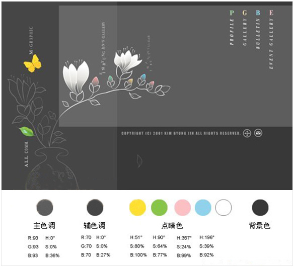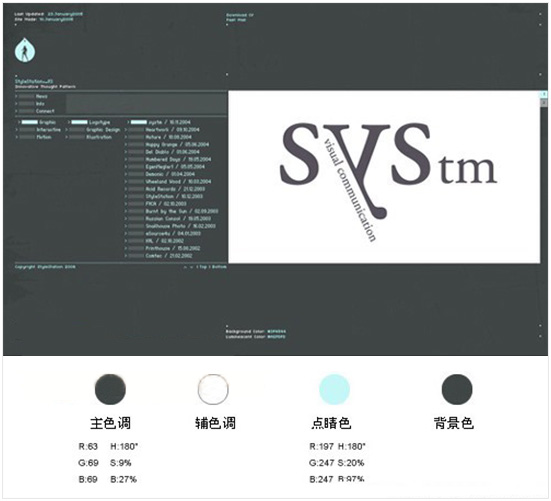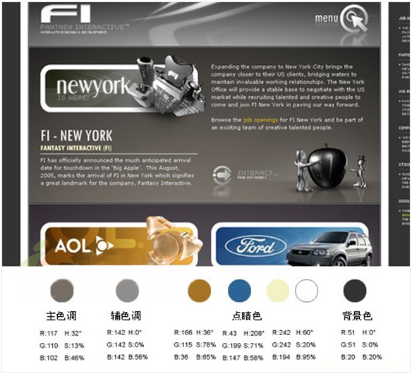 HSB模式的B也能看出浅灰色在明度上较高,部分渐变的深灰色在页面上所占用的面积也不少,另一点睛色黑色的作用就是使明度色阶跨度加深、明确,整个页面呈现灰蒙蒙的感觉得以减弱。