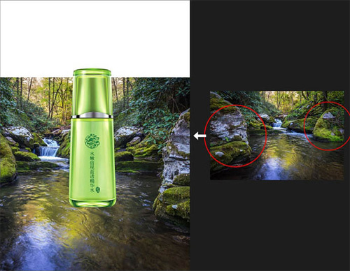 1、首先把产品放入画面中央,然后把一张有水面的素材放入画面,咱们先来合成背景。