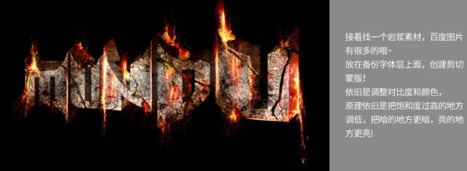 8、接着找一个岩浆素材,放在备份字体层上面,创建剪切蒙版,依旧是调整对比度和颜色。