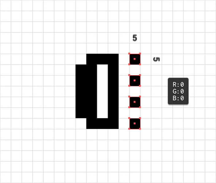 使用矩形工具(M),画四个5像素的正方形,确保填充颜色为黑色,然后将它们如下图所示摆放。