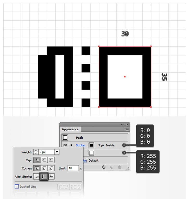 使用矩形工具(M),创建一个30×35 PX的矩形,如下图所示,并保持它在选中的状态,可以打开外观进行观察。(窗口>外观)。