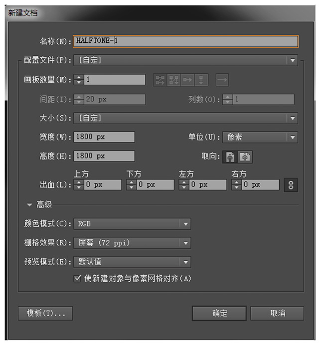 打开AI,新建一个图形,图形的大小设置为1800px*1800px。