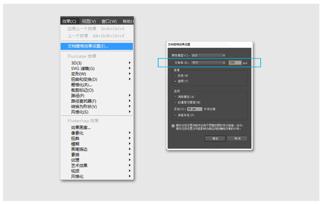 在开始绘制图形前,进入【效果>文档栅格效果设置】,在设置面板中分辨率一栏选择“其他”,输入288。由于我们要运用到栅格化的效果,普通的矢量图遇到栅格化后会因为分辨率的问题让效果大打折扣,在此,我们将72ppi扩大4倍,这样输出的栅格效果就更加完美。