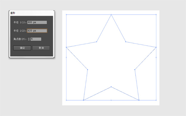 利用星形工具,选中星形工具图标,在画布的任意地方双击两下,这时会弹出星形工具设置面板。在设置中,将半径1设置为800,半径2设置为420,角点数设置为5。这些数值所表达的意思,相信大家可以通过不断尝试获得自己的理解。在此不再赘述。这时保持黑色描边,白色填充即可。