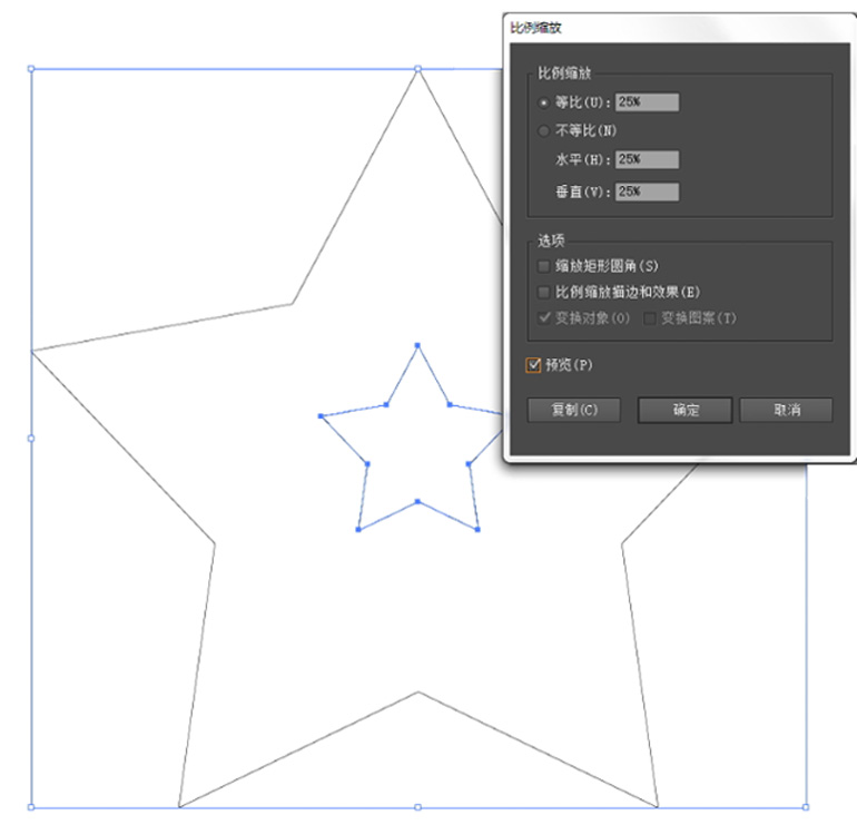 让我们再来画一个小的星形,选中已经画好的星形,利用快捷组合键ctrl+c复制,ctrl+f粘贴在前面。这时两个星形重叠在一起,表面上我们看不出任何变化。我们再选中复制的星形,然后点击右键,选择【缩放】,在缩放面板中等比缩放里设置25%。这就是把原有图形按等比例大小缩放。